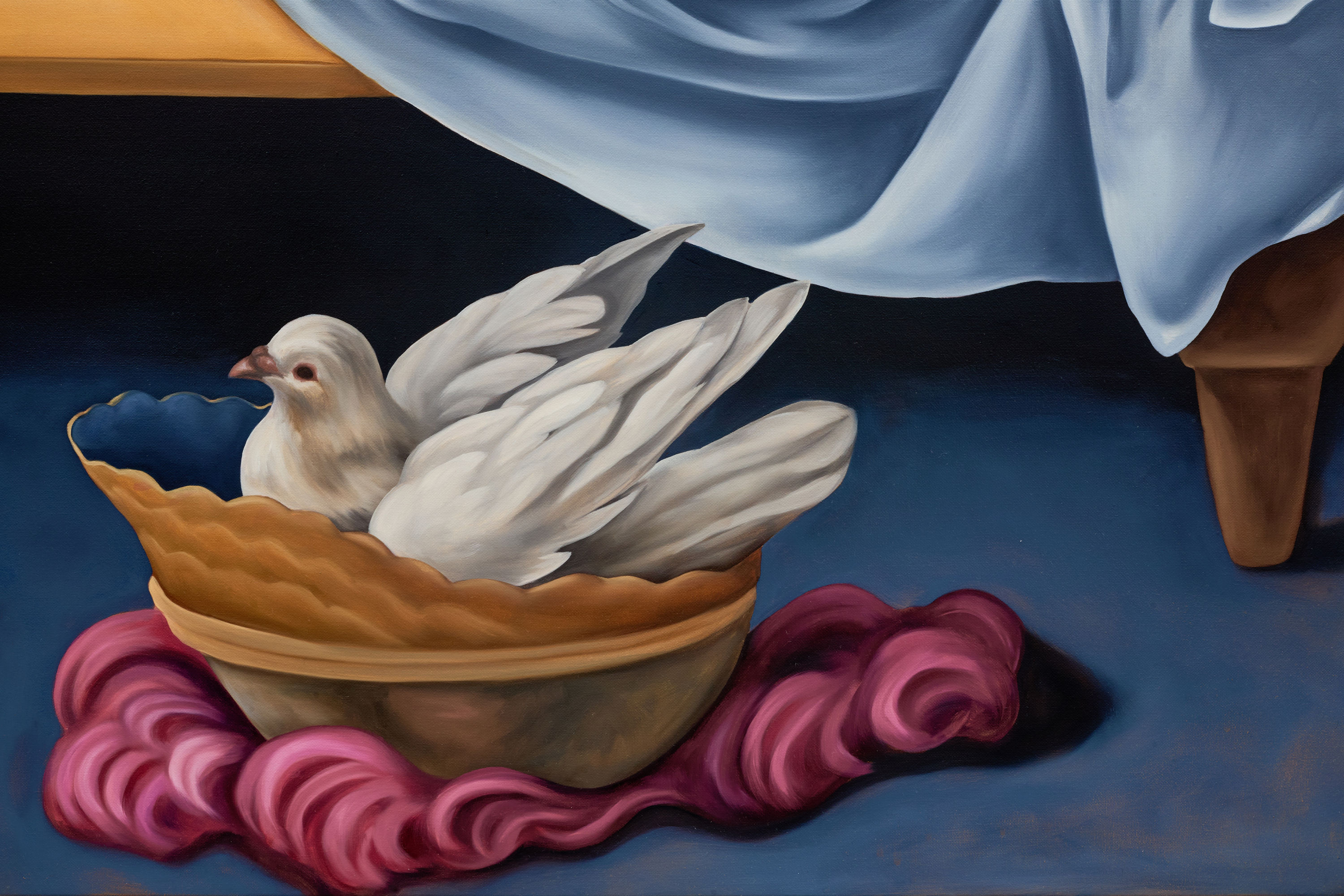 Symbolism permeates every element of the show. Nocturnal references abound: the moon, the shadows, the cool light that bathes everything in ambiguity. These lunar cues gesture not only to Artemis’s dominion over night but also to the subconscious, the emotional underworld where so much of our psychic life unfolds. The small trio of moths that flutter throughout the smaller paintings, The same worms that and Someday eat you too, act as spectral companions to Artemis, goddess of the moon. Their delicate presence suggests vulnerability, transformation, and an instinctual longing for something luminous and unknowable. The works oscillate between clarity and obscurity, containment and chaos, suggestion and eruption. The deep saturated blues, bruised purples and deep greens, that are constant throughout this presentation, mirror a place between day and night, a threshold between now and then: a place of mystery, beauty, and instinct.
